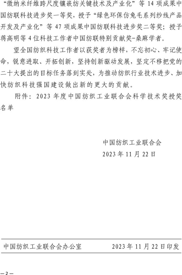 “科技創(chuàng)新是行業(yè)高質(zhì)量發(fā)展的驅(qū)動(dòng)力,大會(huì)的召開將進(jìn)一步引領(lǐng)紡織行業(yè)的高質(zhì)量發(fā)展,助力紡織科技強(qiáng)國(guó)建設(shè)。”12月6日,2023年度中國(guó)紡織工業(yè)聯(lián)合會(huì)科學(xué)技術(shù)獎(jiǎng)勵(lì)大會(huì)在人民大會(huì)堂隆重召開。
