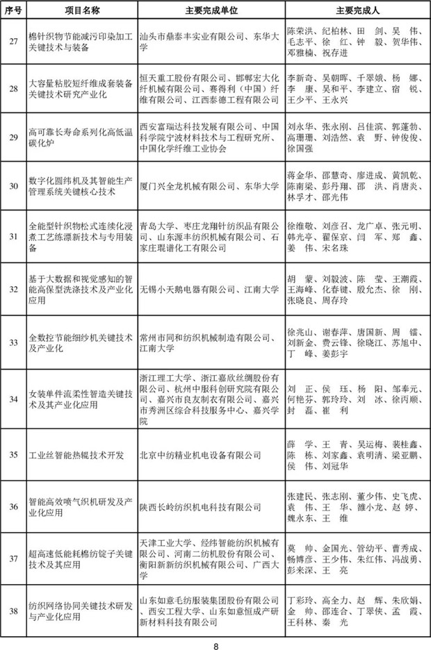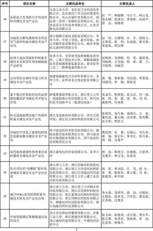 大會(huì)表彰了為我國(guó)紡織科技事業(yè)發(fā)展作出突出貢獻(xiàn)的科技工作者。其中,技術(shù)發(fā)明和科技進(jìn)步獎(jiǎng)67項(xiàng),特別貢獻(xiàn)獎(jiǎng)-桑麻學(xué)者4人。產(chǎn)業(yè)用紡織品領(lǐng)域共有18項(xiàng)成果獲獎(jiǎng),技術(shù)發(fā)明一等獎(jiǎng)1項(xiàng),二等獎(jiǎng)2項(xiàng),科技進(jìn)步一等獎(jiǎng)4項(xiàng),二等獎(jiǎng)11項(xiàng)(名單附后)。