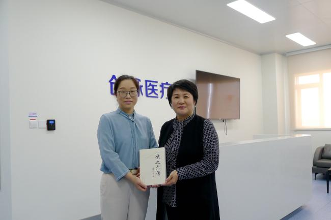 李陵申、李桂梅代表紡織之光科技教育基金會分別向王璐、馬曉曼贈予《錢之光傳》。