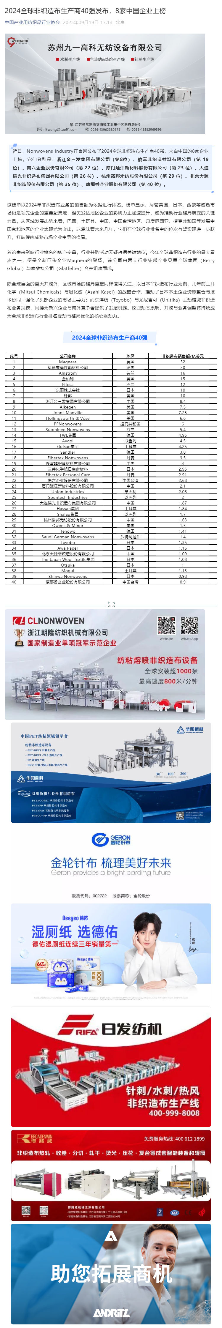 2024全球非織造布生產(chǎn)商40強發(fā)布,8家中國企業(yè)上榜