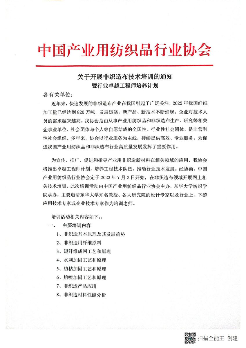 關(guān)于開(kāi)展非織造布技術(shù)培訓(xùn)的通知暨行業(yè)卓越工程師培養(yǎng)計(jì)劃