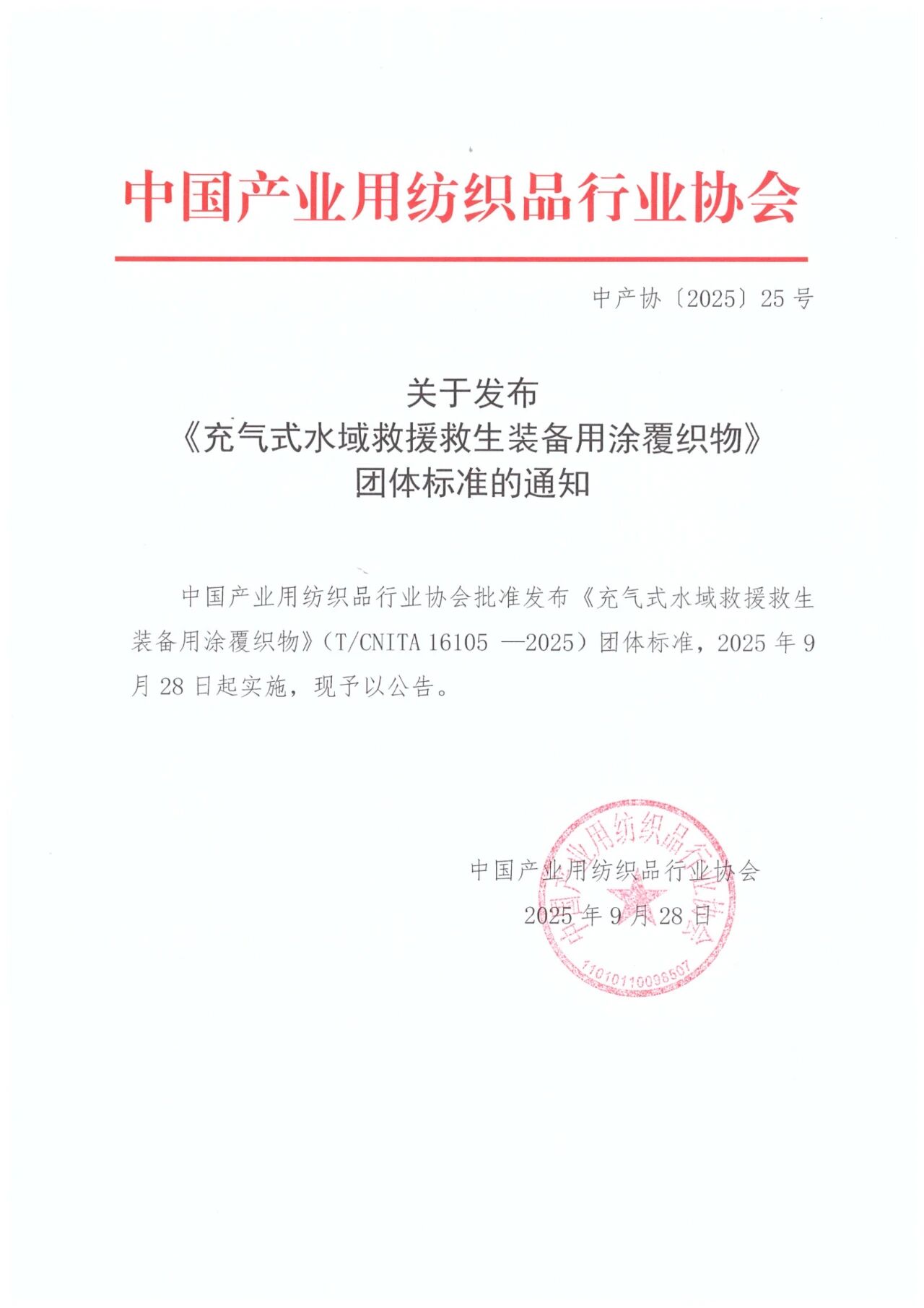 關(guān)于發(fā)布《充氣式水域救援救生裝備用涂覆織物》團(tuán)體標(biāo)準(zhǔn)的通知