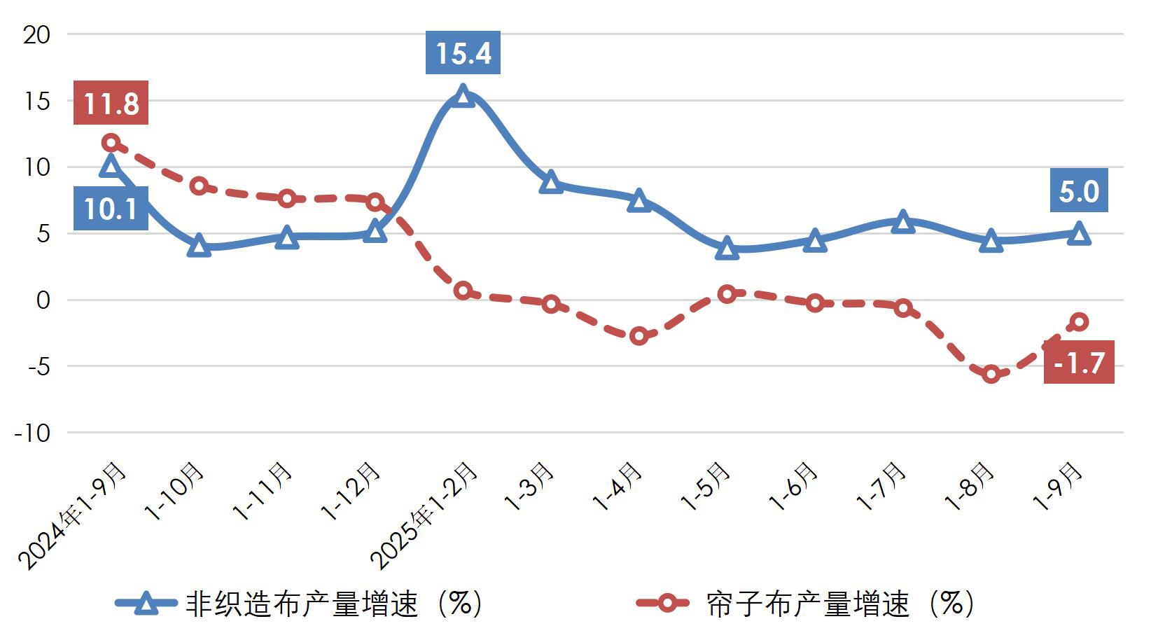 圖2 近一年我國非織造布、簾子布產(chǎn)量增速情況(規(guī)模以上)