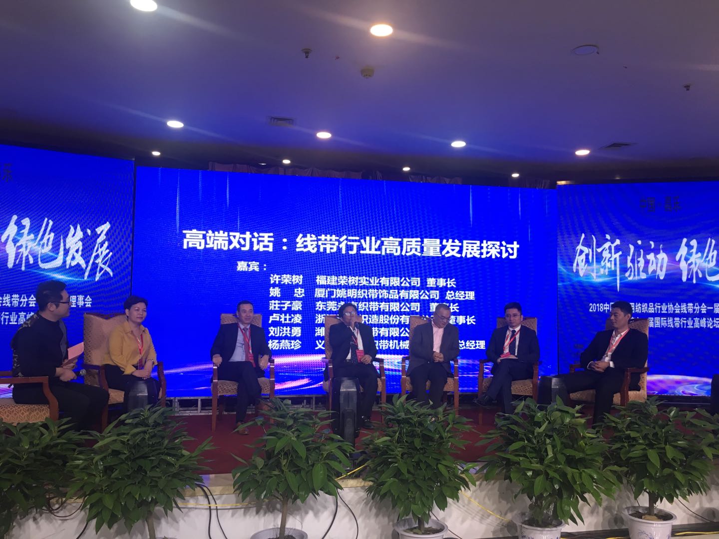 在“線帶行業(yè)高質(zhì)量發(fā)展探討”環(huán)節(jié),邀請到福建榮樹實業(yè)有限公司董事長許榮樹、廈門姚明織帶飾品有限公司總經(jīng)理姚忠、東莞永亨織帶有限公司董事長莊子豪、浙江澳亞織造股份有限公司董事長盧壯凌、濰坊豐源織帶有限公司總經(jīng)理劉洪勇、義烏市迪隆織帶有限公司總經(jīng)理楊燕珍行業(yè)內(nèi)六位精英從織帶加工質(zhì)量提升、海外市場拓展和設(shè)廠經(jīng)驗分享、新產(chǎn)品開發(fā)、企業(yè)管理、生產(chǎn)智能化等方面進行互動和探討。