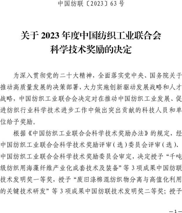 大會(huì)表彰了為我國(guó)紡織科技事業(yè)發(fā)展作出突出貢獻(xiàn)的科技工作者。其中,技術(shù)發(fā)明和科技進(jìn)步獎(jiǎng)67項(xiàng),特別貢獻(xiàn)獎(jiǎng)-桑麻學(xué)者4人。產(chǎn)業(yè)用紡織品領(lǐng)域共有18項(xiàng)成果獲獎(jiǎng),技術(shù)發(fā)明一等獎(jiǎng)1項(xiàng),二等獎(jiǎng)2項(xiàng),科技進(jìn)步一等獎(jiǎng)4項(xiàng),二等獎(jiǎng)11項(xiàng)(名單附后)。