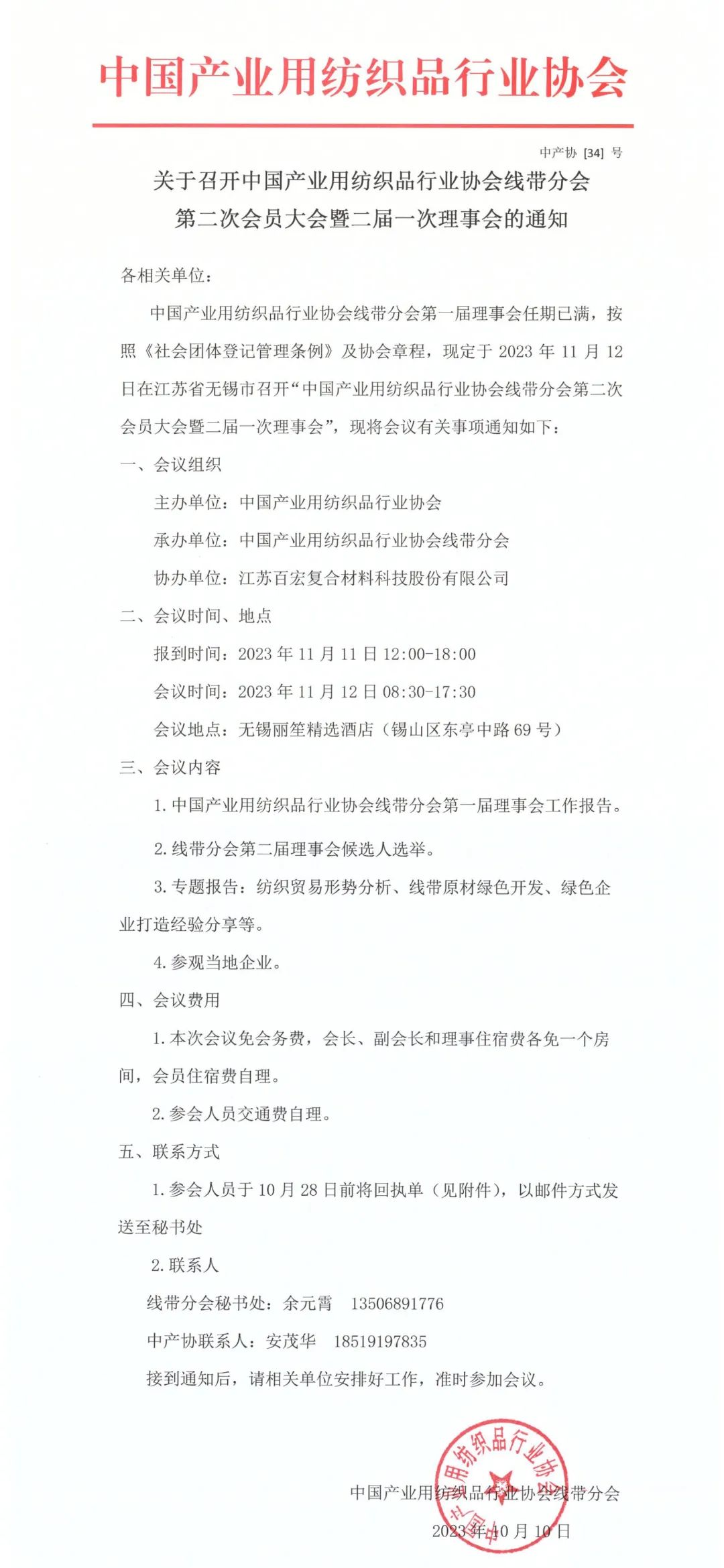 關(guān)于召開中國產(chǎn)業(yè)用紡織品行業(yè)協(xié)會(huì)線帶分會(huì)第二次會(huì)員大會(huì)暨二屆一次理事會(huì)的通知.pdf