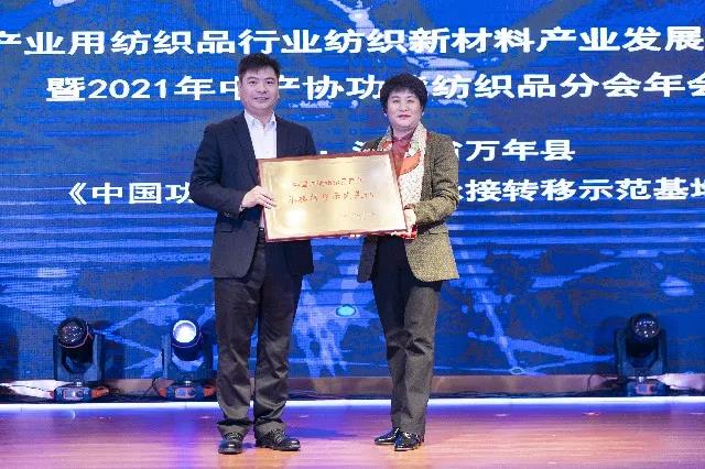 中國產(chǎn)業(yè)用紡織品行業(yè)協(xié)會(huì)會(huì)長李桂梅為萬年縣授《中國功能紡織品產(chǎn)業(yè)承接轉(zhuǎn)移示范基地》牌匾。