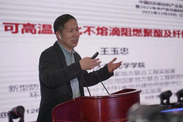 中國工程院院士、四川大學(xué)教授王玉忠作了“可高溫炭化不溶滴阻燃聚酯及纖維”主題報(bào)告。王玉忠指出,傳統(tǒng)阻燃方法存在溶滴問題,這也是阻燃領(lǐng)域長期未解決的國際難題。他說,通過分子設(shè)計(jì),在聚酯大分子鏈中引入可高溫自交聯(lián)基團(tuán),使共聚酯在高溫或燃燒溫度下快速發(fā)生快速“化學(xué)交聯(lián)”,進(jìn)而炭化,從而實(shí)現(xiàn)不溶滴和高阻燃性的目標(biāo),并且熱釋放速率和煙密度都顯著下降。