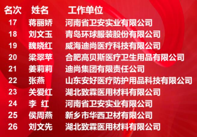 授予在全國決賽中獲得第十七至第二十六名的10位同志“全國產(chǎn)業(yè)用紡織品行業(yè)縫紉(防護服)操作能手”。
