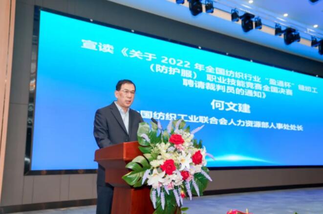 中國(guó)紡織工業(yè)聯(lián)合會(huì)人力資源部人事處處長(zhǎng)何文建宣讀《關(guān)于 2022 年全國(guó)紡織行業(yè)(防護(hù)服)職業(yè)技能競(jìng)賽全國(guó)決賽聘請(qǐng)裁判員的通知》。