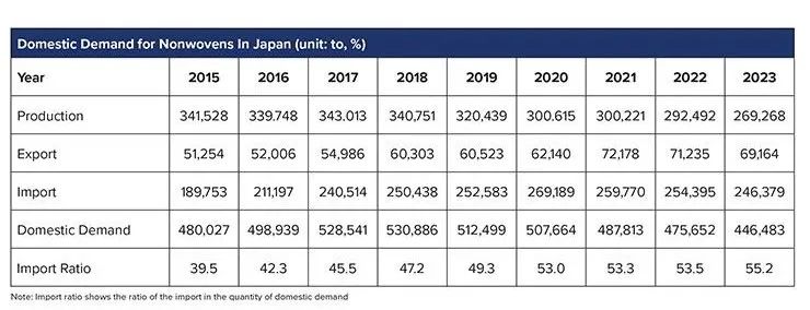 自2019年以來(lái),日本對(duì)非織造布的需求已連續(xù)下降五年。2023年,進(jìn)口非織造布在國(guó)內(nèi)需求中的占比為55.2%。從2020年到2022年,進(jìn)口非織造布的占比保持在53%,但在2023年有所增加。非織造布需求下降的最大影響因素是紙尿褲產(chǎn)量的減少,2023年減少了9.7%。此外,隨著新冠疫情得到控制,對(duì)口罩和濕巾等非織造布產(chǎn)品的需求急劇下降,2023年,包括這些產(chǎn)品在內(nèi)的醫(yī)療保健和衛(wèi)生用非織造布的產(chǎn)量大幅下降17.6%。然而,汽車(chē)用非織造布的產(chǎn)量增長(zhǎng)了8.8%,而日本汽車(chē)產(chǎn)量增長(zhǎng)了14.8%。除此之外,所有其他應(yīng)用領(lǐng)域都發(fā)展緩慢。
