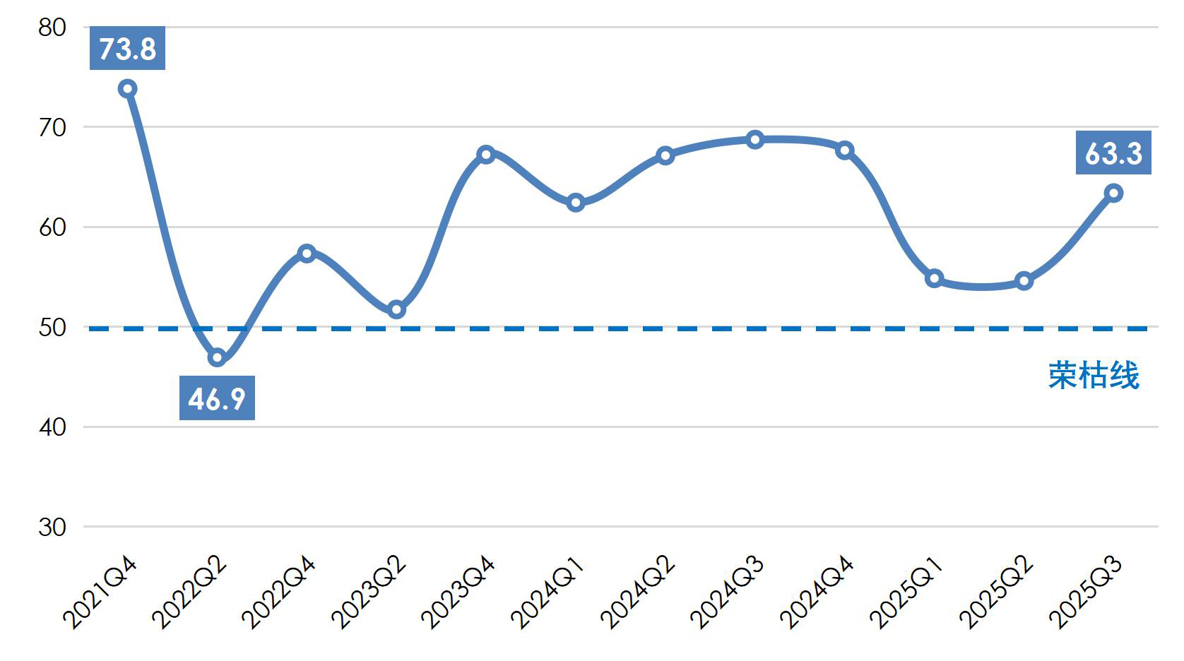 2025年前三季度,全球經(jīng)濟(jì)復(fù)蘇乏力、地緣政治沖突持續(xù)、主要經(jīng)濟(jì)體貨幣政策不確定性猶存;我國經(jīng)濟(jì)運行保持穩(wěn)中有進(jìn)態(tài)勢,高質(zhì)量發(fā)展取得積極成效。面對復(fù)雜嚴(yán)峻的外部環(huán)境,我國產(chǎn)業(yè)用紡織品行業(yè)經(jīng)濟(jì)運行總體保持平穩(wěn),行業(yè)的生產(chǎn)、經(jīng)濟(jì)效益指標(biāo)增速有所放緩,出口呈現(xiàn)溫和回暖趨勢。根據(jù)中國產(chǎn)業(yè)用紡織品行業(yè)協(xié)會調(diào)研,2025年前三季度我國產(chǎn)業(yè)用紡織品行業(yè)景氣指數(shù)為63.3,較上半年提升8.7個點(圖1)。