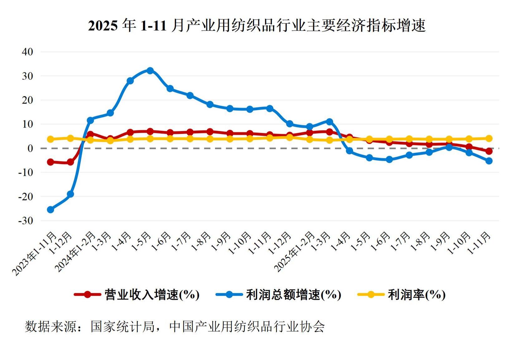 經(jīng)濟(jì)效益方面,根據(jù)國家統(tǒng)計(jì)局?jǐn)?shù)據(jù),1-11月產(chǎn)業(yè)用紡織品行業(yè)規(guī)模以上企業(yè)的營業(yè)收入和利潤總額分別同比下降1.3%和5.3%;營業(yè)利潤率為4.0%,同比下降0.2個(gè)百分點(diǎn)。
