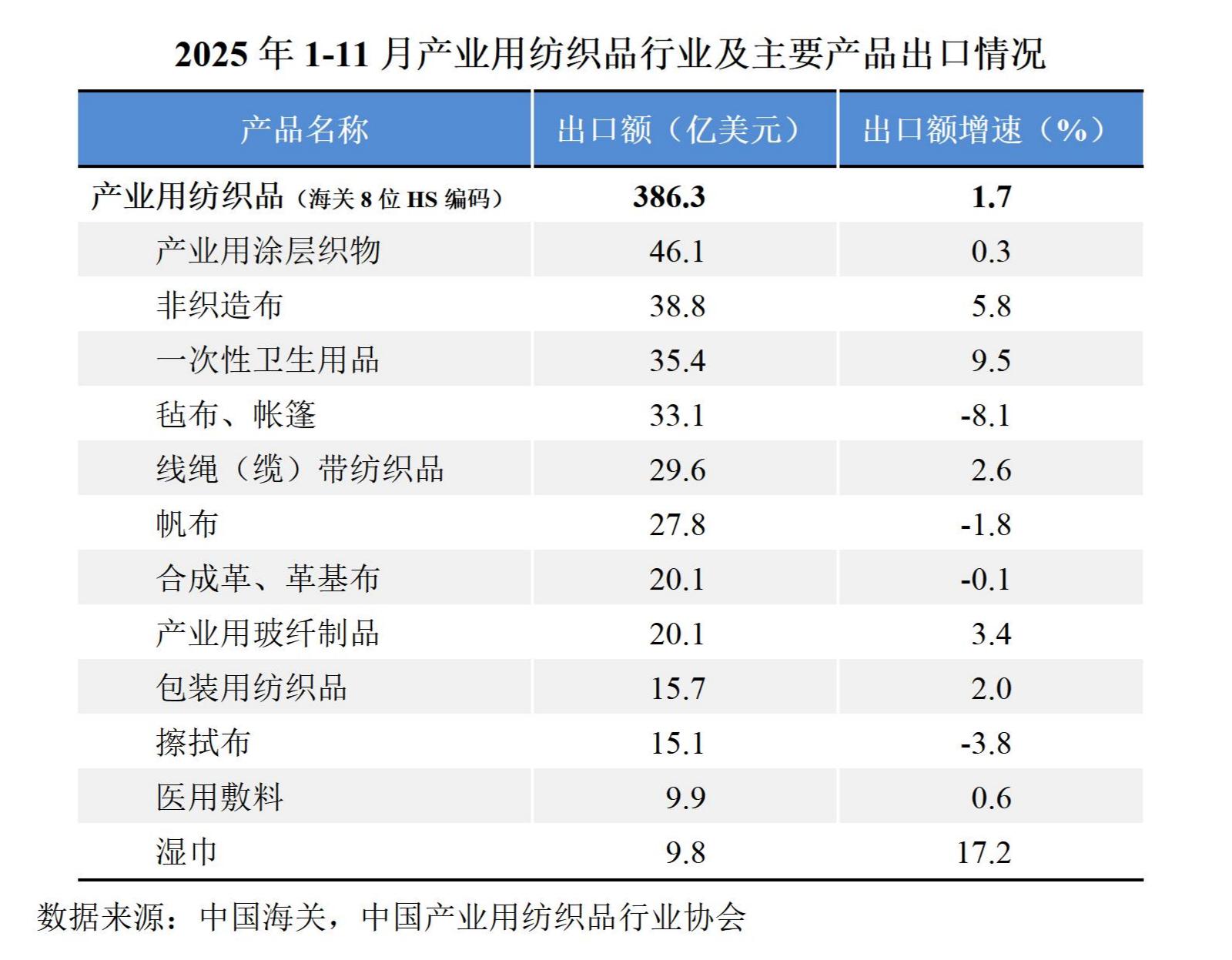 國際貿(mào)易方面,根據(jù)中國海關(guān)數(shù)據(jù)(海關(guān)8位HS編碼統(tǒng)計(jì)數(shù)據(jù)),2025年1-11月我國產(chǎn)業(yè)用紡織品行業(yè)的出口額為386.3億美元,同比增長1.7%;行業(yè)進(jìn)口額為49.9億美元,同比增長3.8%。